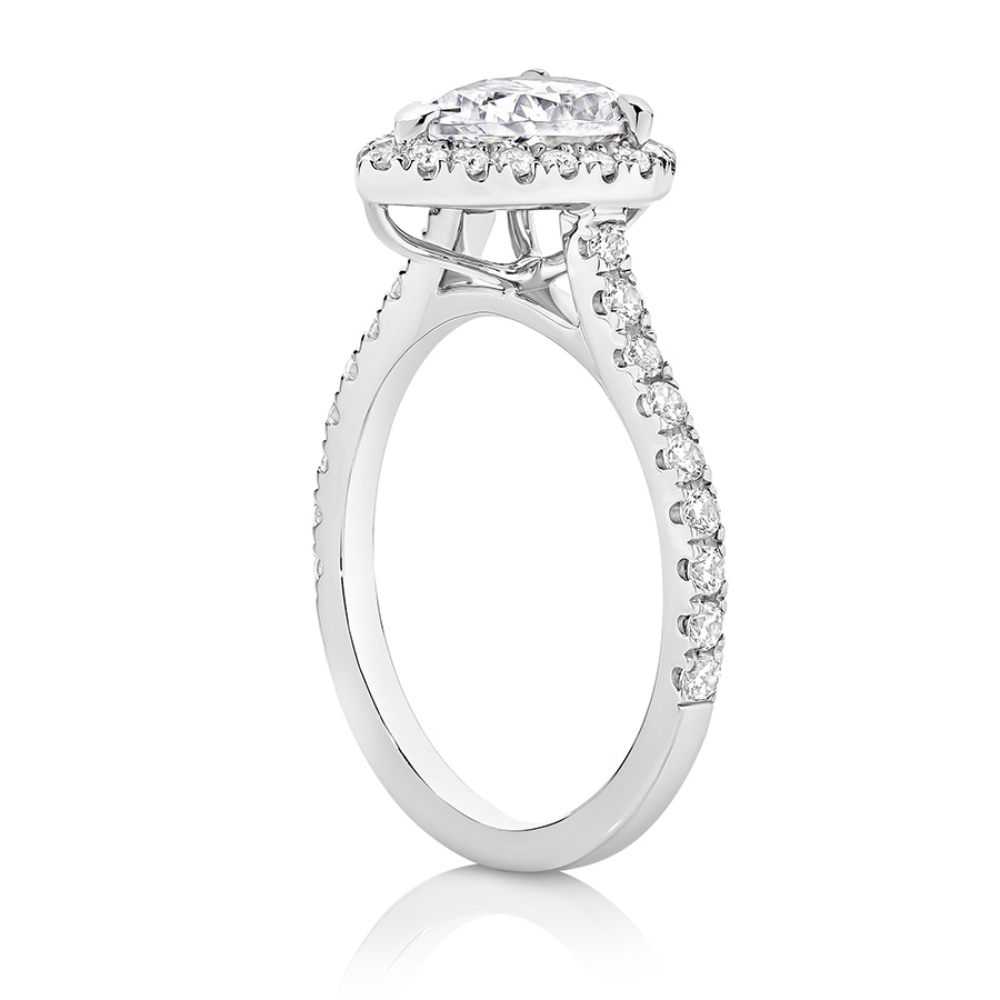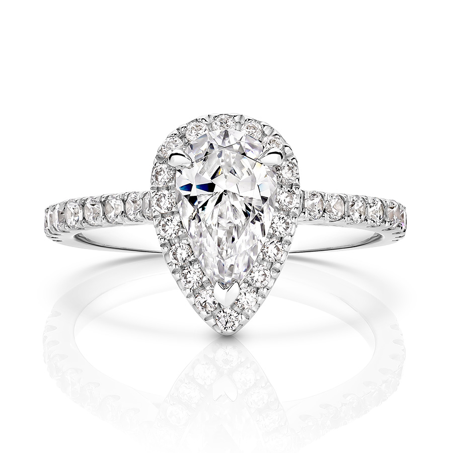 1.0 ct Centre Stone Halo Pear Cut with a Diamond band .  Lab grown diamonds.