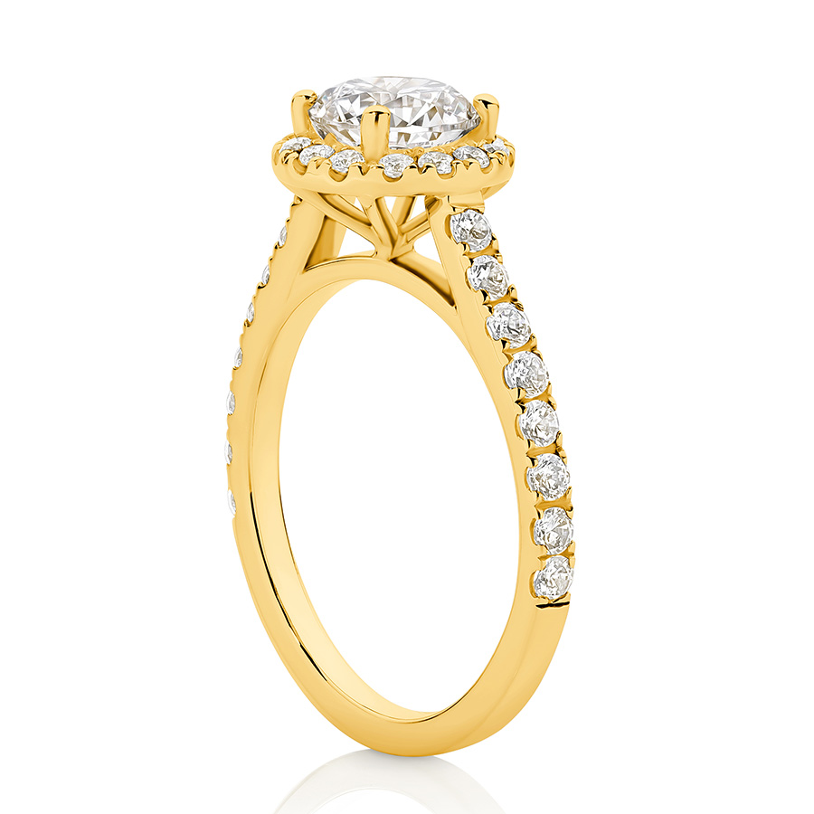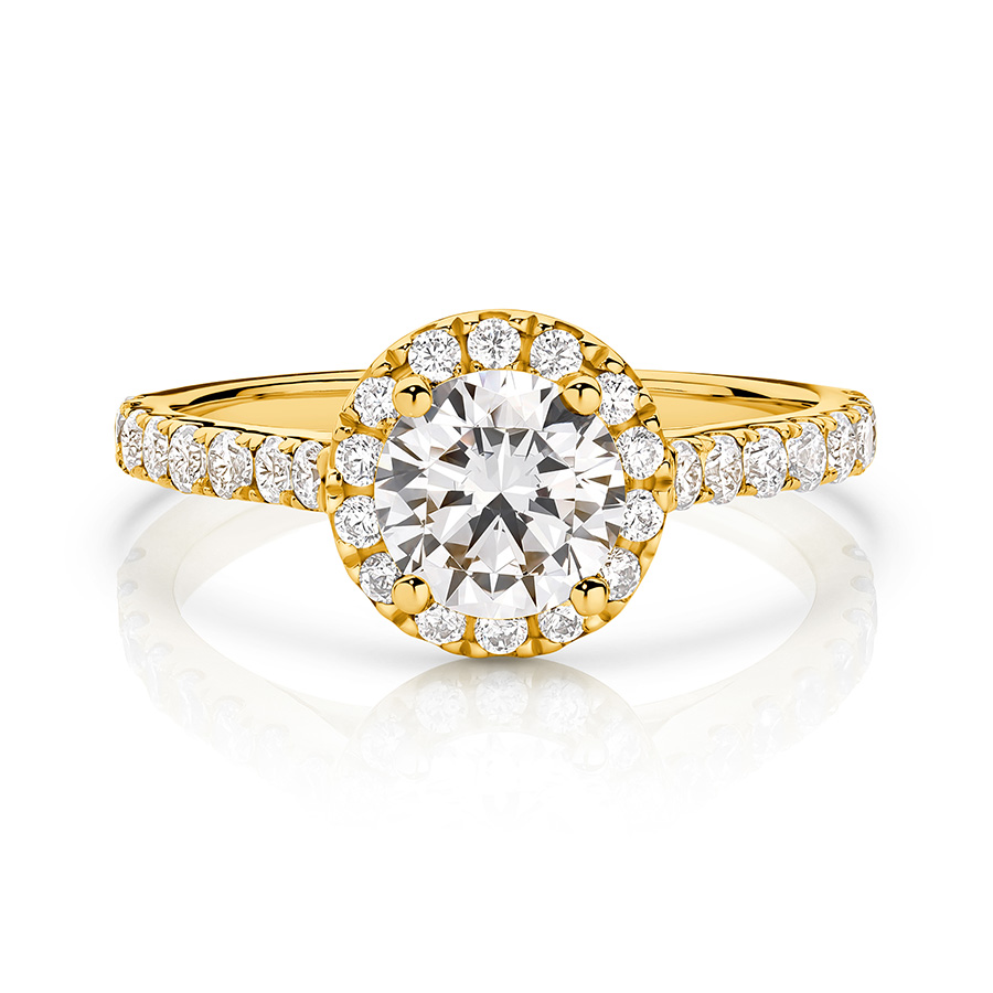 1.0 ct Centre Stone Halo Round Brilliant Cut with a Diamond band . Lab grown diamonds.