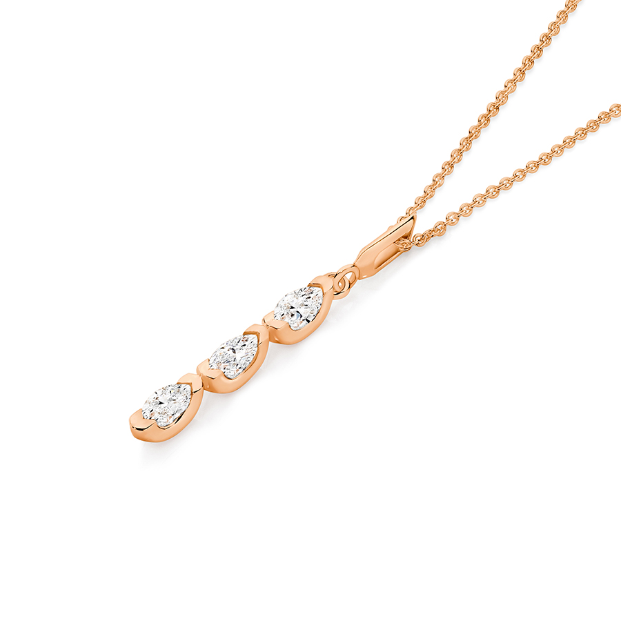 Capture the essence of romance with our Three Marquise Diamond Pendant, beautifully rendered in the warm blush of 9ct rose gold. This piece is a true celebration of modern femininity and is a stunning addition to any jewellery box. As a leading jewellery store in Sydney, we take pride in offering unique pendants that tell a story, and this design radiates a captivating, romantic allure.